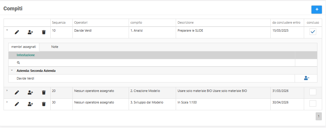 Ogni compito può essere creato, modificato o eliminato. A ciascun compito è possibile assegnare uno o più operatori, scegliendoli tra i membri già associati al progetto nel pannello Membri.