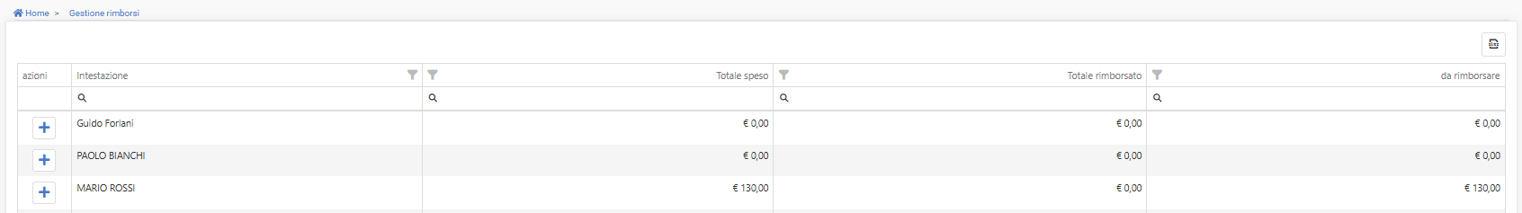 Aprendo la sezione GESTIONE RIMBORSI compare l'elenco di tutti gli operatori inseriti nel gestionale, con già una panoramica di: