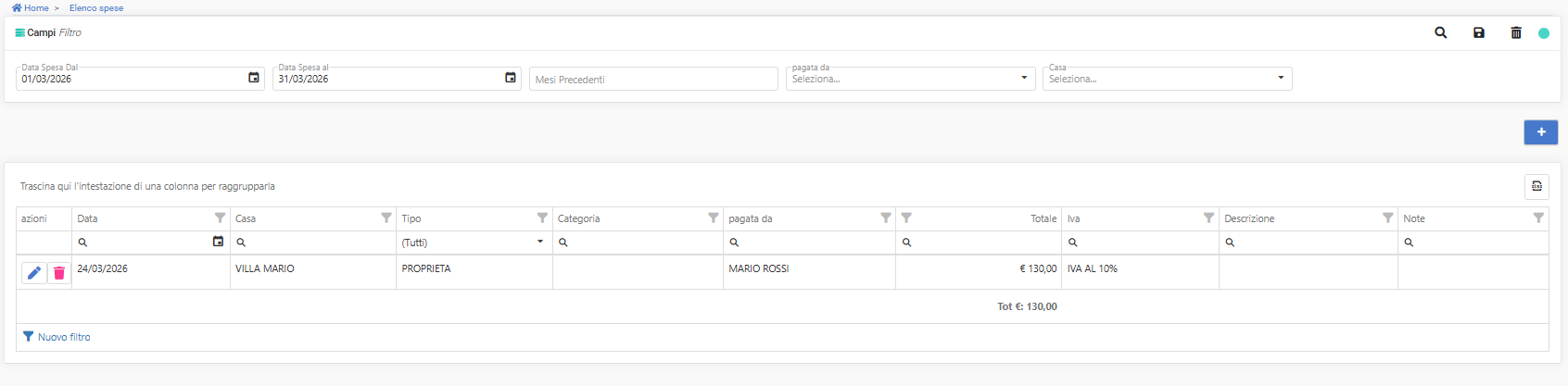 Sotto è presente l'elenco dove è possibile (trascinando l'intestazione di una colonna sopra la griglia) raggruppare i risultati per ottenere già delle analisi sulle spese.