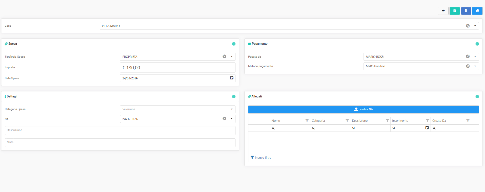 Una volta salvata la spesa, compare il tasto "CARICA ALLEGATI" per allegare foto, documenti ecc. alla spesa