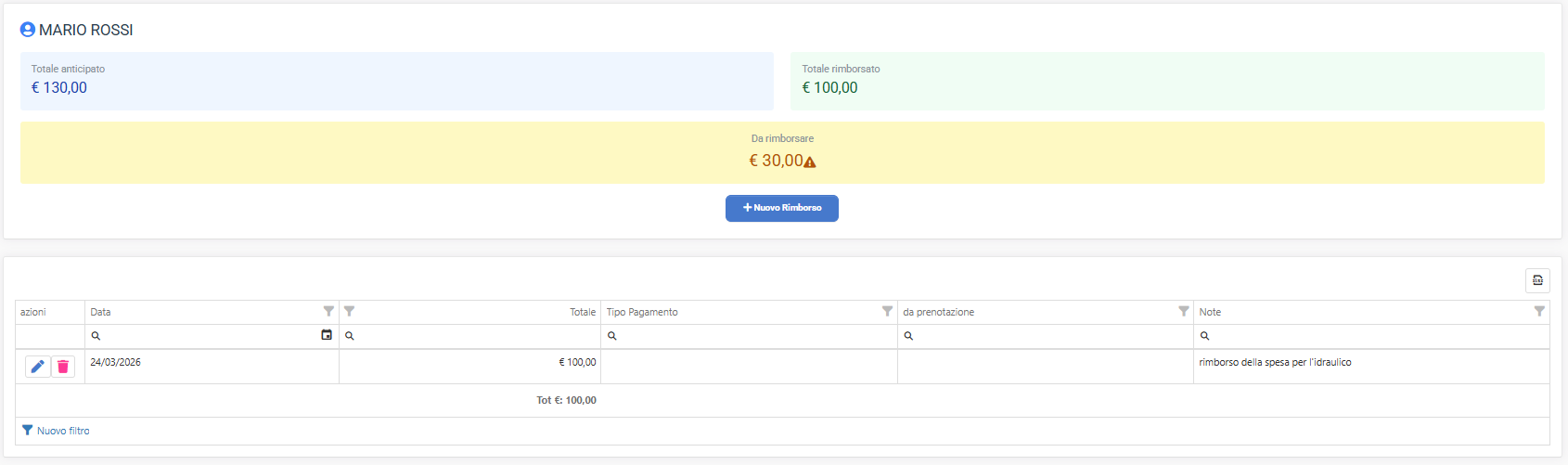 L'elenco dei rimborsi da la possibilità di modificare o eliminare un rimborso.