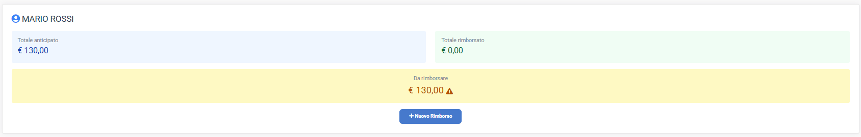 la pagina si apre con un pannello riassuntivo con i totali ed il bottone per inserire un nuovo rimborso.