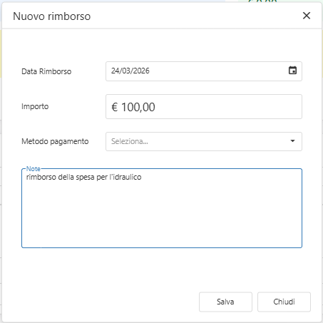 dove ci viene chiesto Data, Importo, Metodo di pagamento del rimborso, eventuali Note.