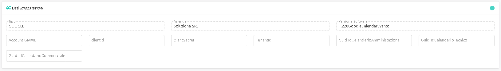 Accont GMAIL: utente gmail che gestisce le Chiamate API - ClientId : parametro assegnato al progetto creato nella "console.cloud.google" - ClientSecret: parametro assegnato al progetto creato nella "console.cloud.google" - TenantId: parametro assegnato al progetto creato nella "console.cloud.google" - Guid:IdCalendarioAmministazione: IdCalendarioEsterno utilizzato di default se non presente nell'anagrafica UTENTE - Guid:IdCalendarioTecnico: IdCalendarioEsterno utilizzato di default se non presente nell'anagrafica UTENTE - Guid:IdCalendarioCommerciale: IdCalendarioEsterno utilizzato di default se non presente nell'anagrafica UTENTE