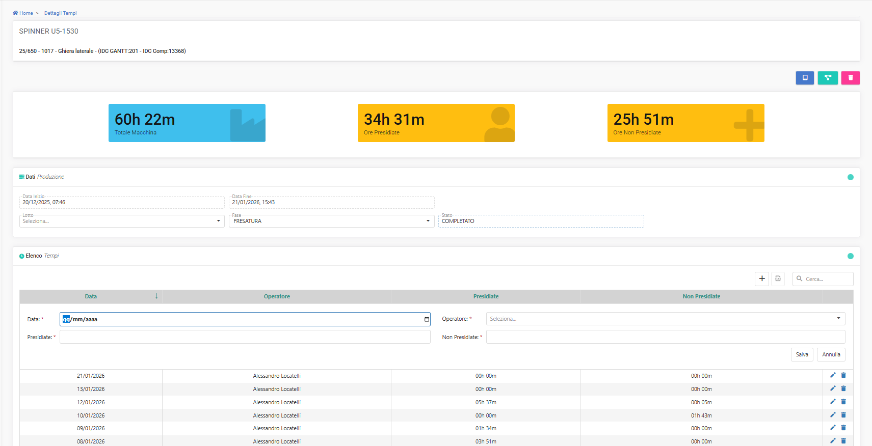 Nella maschera di dettaglio della produzione ci sarà la possibilità di modificare le ore presidiate e non, cosi come visto nella maschera gestione tempi generale.