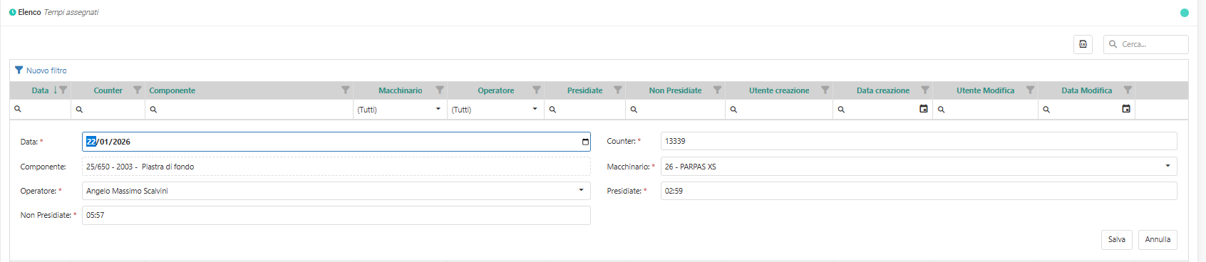 Ogni campo è modificabile, tranne "Componente" che verrà aggiornato al cambio del counter associato e "Macchinario" perché si andrebbe a falsare un dato proveniente dall'esterno.