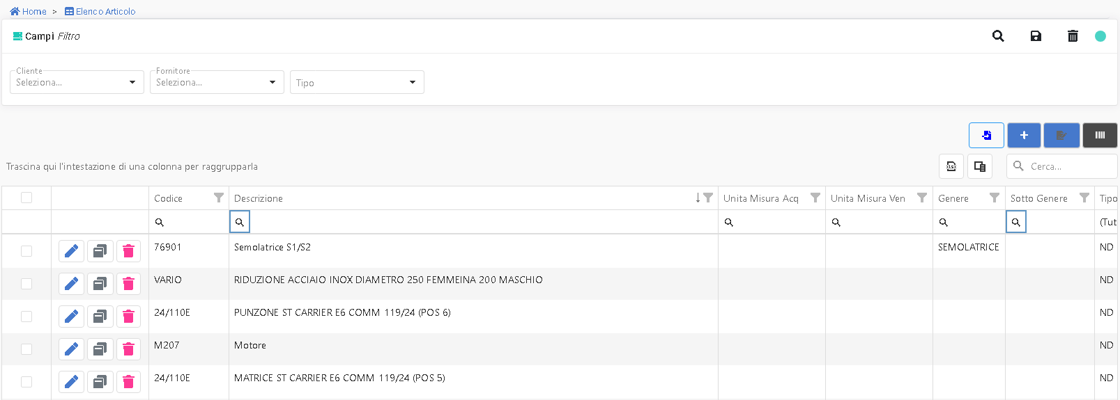 - Tipo: (0,1,2,3) che equivalgono a: ND, PRODOTTO_FINITO, SEMI_LAVORATO, MATERIA_PRIMA