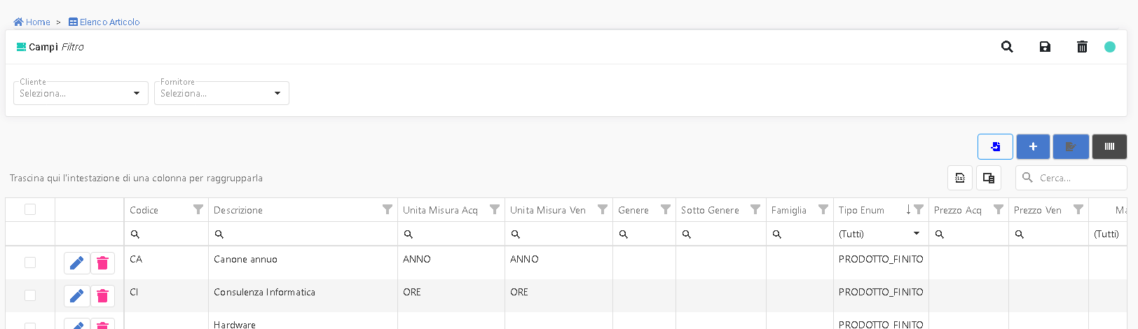- Tipo: (0,1,2,3) che equivalgono a: ND, PRODOTTO_FINITO, SEMI_LAVORATO, MATERIA_PRIMA
