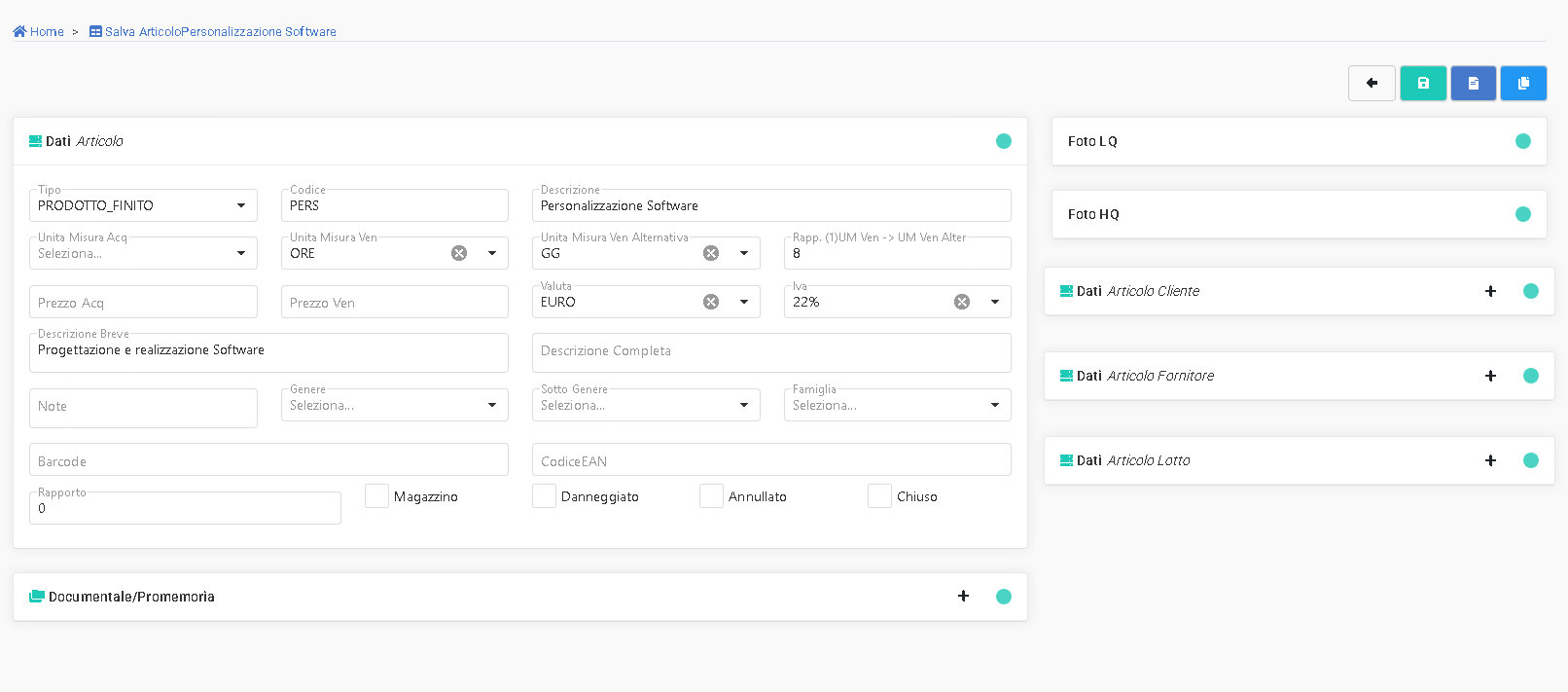 Questa sezione serve per l'inserimento dei dati standard articolo.
